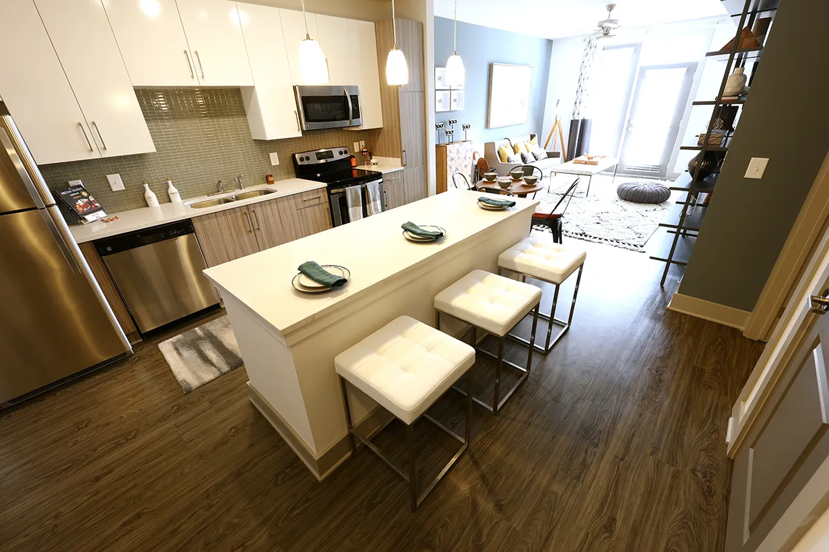 Our modern studio, one-, two-, and three-bedroom homes showcase quartz countertops, five-panel interior doors, and GE Energy Star rated stainless steel appliances. The lavish sophistication continues with lofty ceilings, floor-to-ceiling windows dressed with solar shades and waterfall edge center island.